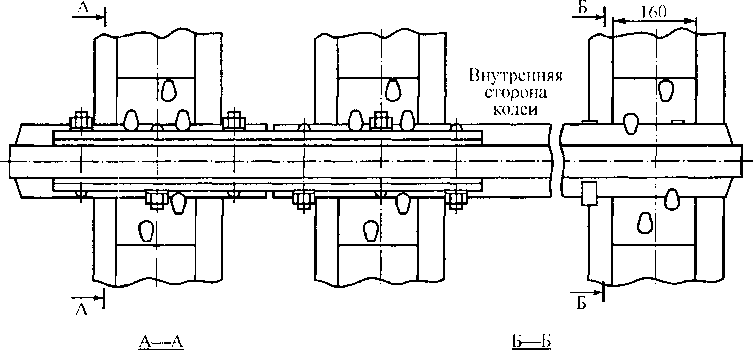 Противоугонные скрепления бывают болтовыми и безболтовыми. Подкладочные скрепления подразделяются на раздельные, нераздельные и смешанные. В раздельном скреплении рельс к подкладке и подкладка к шпале прикрепляются разными прикрепителями, а в нераздельном скреплении рельс с подкладкой соединяется со шпалой одними и теми же прикрепителями. В смешанном скреплении рельс через подкладку соединяется со шпалой, а подкладка, кроме того, самостоятельно прикрепляется к шпале. На пути с деревянными шпалами в настоящее время применяются смешанное скрепление типа ДО (рис. 9.14) и раздельные скрепления типов КД и Д4, (рис. 9.15), в которых рельс прижат к подкладке двумя клеммами с помощью натяжных болтов. При скреплениях типа ДО на прямых и кривых радиусом больше 1200 м рельсы пришиваются костылями на каждом конце промежуточной шкалы четырьмя костылями, а на стыковой шпале пятью костылями. В кривых радиусами менее 1200 м, на мостах, в тоннелях и на участках скоростного движения свыше 120 км/ч на всех шпалах рельсы прошиваются пятью костылями.