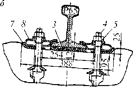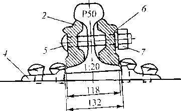 Рис. 9.! 2. Стыковое и промежуточное костыльное скрепление рельсов типа Р50: / — рельсовый соединитель; 2 — двухголовая накладка; 3 — противоугон; 4 — подкладка; 5 — путевой болт; 6 — пружинная шайба;