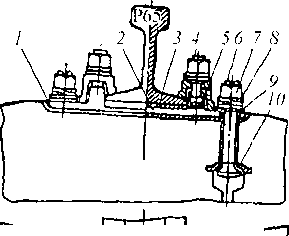 | Рис. 9.16. Раздельные скрепления КБ для железобетонных шпал: / —- прокладка под подкладку; 2 — подкладка; 3 — подрельсовая прокладка; 4 - - клеммный болт; 5 — жесткая клемма; б — закладной болт; 7- - гайка; (У--двухвитковая шайба; 9 - изолирующая втулка; 10- опорная шайба |