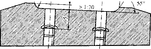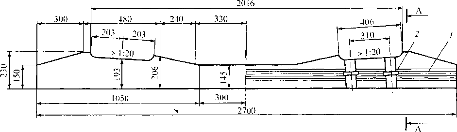 В 1959 г. на отечественных железных дорогах началась массовая укладка железобетонных шпал, в настоящее время общее протяжение таких путей составляет 48,8 тыс. км, в том числе на главных путях МПС России — 37,3 тыс. км. Современная железобетонная шпала (рис. 9.20) — цельнобрусковая из предварительно напряженного железобетона, армированная высокопрочной проволокой, соответствует требованиям ГОСТ 10629-88 и ТУ 5864-019-11337151-95. Промышленностью серийно выпускаются железобетонные шпалы типа Ш-1-1 для раздельного клеммно-болтового скрепления КБ, изготовленные из тяжелого бетона класса по прочности на сжатие В40 (М500) и марки F200 (Мрз200). В качестве арматуры применяется стальная проволока диаметром 3 мм, натянутая с усилием 8,1 кН; номинальное число проволок в шпале 44.
