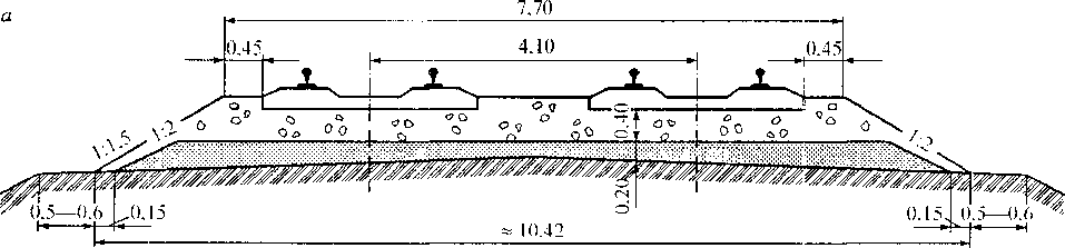 Балласт укладывается на земляное полотно в форме балластной призмы, которая бывает однослойная, двухслойная (щебеночный или асбестовый балласт поверх песчаной подушки); трехслойная (асбестовый балласт поверх щебеночной призмы на песчаной подушке). Для железнодорожных путей установлены типовые поперечные профили балластной призмы или балластного слоя (рис. 9.21).