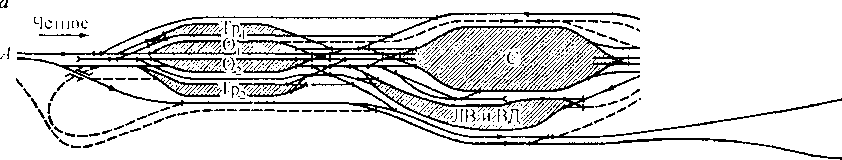 Сортировочные станции предназначены для массовой переработки вагонов и формирования составов по назначениям, установленным планом формирования поездов, и имеющие для выполнения этих работ специальные пути и маневровые устройства. В зависимости от значения в общей работе на железнодорожной сети сортировочные станции делятся на основные сетевого значения (опорные), районные и вспомогательные (в помощь основным или районным в отдельных узлах). В зависимости от типа сортировочных устройств различают горочные и безгороч- ные с вытяжными путями или с полугорками. В зависимости от расположения основных парков имеются три вида станций: с последовательным, параллельным и комбинированным расположением парков. В зависимости от числа сортировочных комплексов сортировочные станции бывают двух типов: односторонние (однокомплектные), на которых в одной системе перерабатываются вагонопотоки всех примыкающих направлений (рис. 10.5, я, б), и двусторонние (двухкомплектные), на которых одна система парков работает в четном, а другая — в нечетном направлении (рис. 10.5, в).