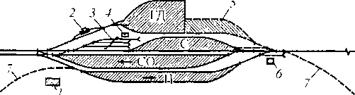 В зависимости от расположения приемо-отправочиых путей различают три основные схемы промежуточных станций (рис. 10.3). На схемах обозначено: ГУ— грузовые устройства; пунктирные линии — необходимое удлинение путей для обеспечения безостановочного скрещения поездов; L —длина станционной площадки; /, 1а и 11— главные пути в пределах станции; 2—6 — приемо-отнравочные пути; 7— вытяжной путь; б’ —тупик.
