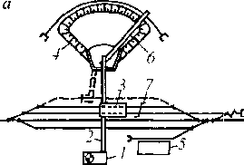 Рис. 10.10. Схемы: a — лесопогрузочной станции: I — погрузочный путь; 2 — район подвозимого к станции леса (или склад лесоматериалов); б — пункт, обслуживающий элеватор: / — приемо-отправоч- ные пути; 2 — весы; 3 — элеватор; 4 — приемные лари; 5 - ходовой путь; 6 — разгрузочные пути; 7 —