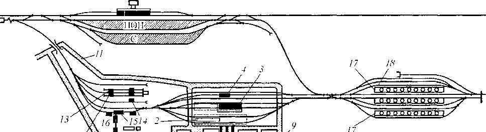 Рис. 10.9. Схема станции примыкания, пункта налива и промывочно-пропарочной станции: ПОП — при- емо-отправочный парк; С -сортировочный парк; 1 — производственно-бытовой корпус; 2--депо пропарки цистерн; 3 — открытая эстакада обработки цистерн; 4 — ангар наружной обмывки цистерн; 5 — промежуточный резервуар для темных нефтепродуктов; 6 — нефтеловушка; 7— промежуточный резервуар для воды; 8 - насосная станция; 9 - - пожарное депо; 10 — трансформаторная подстанция; II — проезд для автотранспорта; 12 — битумохранилище; 13 — платформа; 14— наливная колонка для битума; 15 — насосная; 16 — эстакада для подогрева цистерн; 17 —- наливная эстакада; 18 — пути для очищенных цистерн