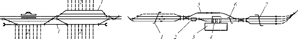 Рис. 10.7. Схемы грузовых станций: a — тупикового типа; б — сквозного; I —техническая контора; 2 — вагонные весы; 3 — пути ремонта вагонов; 4 — пункт технического обслуживания вагонов; 5 -- сквозные пути грузового двора; 6 — экипировка локомотивов; 7 — возможное примыкание подъездных путей