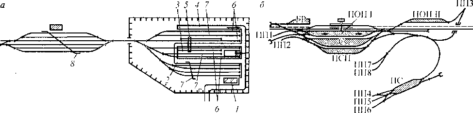 Рис. 10.11. Схемы: а --- станция-терминал ды переработки контейнеров: / — товарная контора; 2 — проезд для автотранспорта; 3— контейнерная площадка; 4 — высокая платформа; 5 — кран; 6— погрузочно-выгрузочные нуги; 7 - выставочные пути; 8— приемо-отправочные и сортировочные пути; б— грузовая станция, обслуживающая подъездные пути: Г1П1 -ПП8 — подъездные пути; ГР— грузовой район; ПОП I —приемо-отправочный парк (в гом числе маршрутов ПП1); С — сортировочный парк; ПСП — приемо-сдаточный парк групп вагонов ПП2, 4—8; ПОП II — приемо-отправочный парк маршрутов ППЗ; ПС — промышленная станция