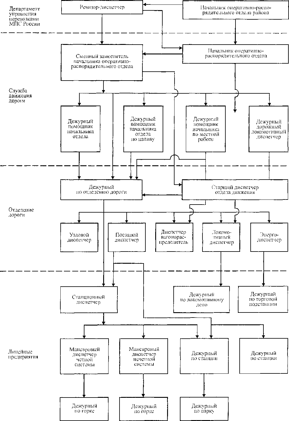 Вся оперативная работа по непосредственному управлению движением поездов на участках или направлениях и маневровой работой на станциях сосредоточена в руках одного ответственного работника — диспетчера, который, имея постоянную связь с объектами управления своей зоны, непрерывно следит за их состоянием и управляет перевозочным процессом, используя специальные средства управления и давая указания соответствующим работникам. Диспетчерское управление охватывает все уровни управления перевозками: станционный, отделенческий, дорожный и сетевой (рис. 11.4).