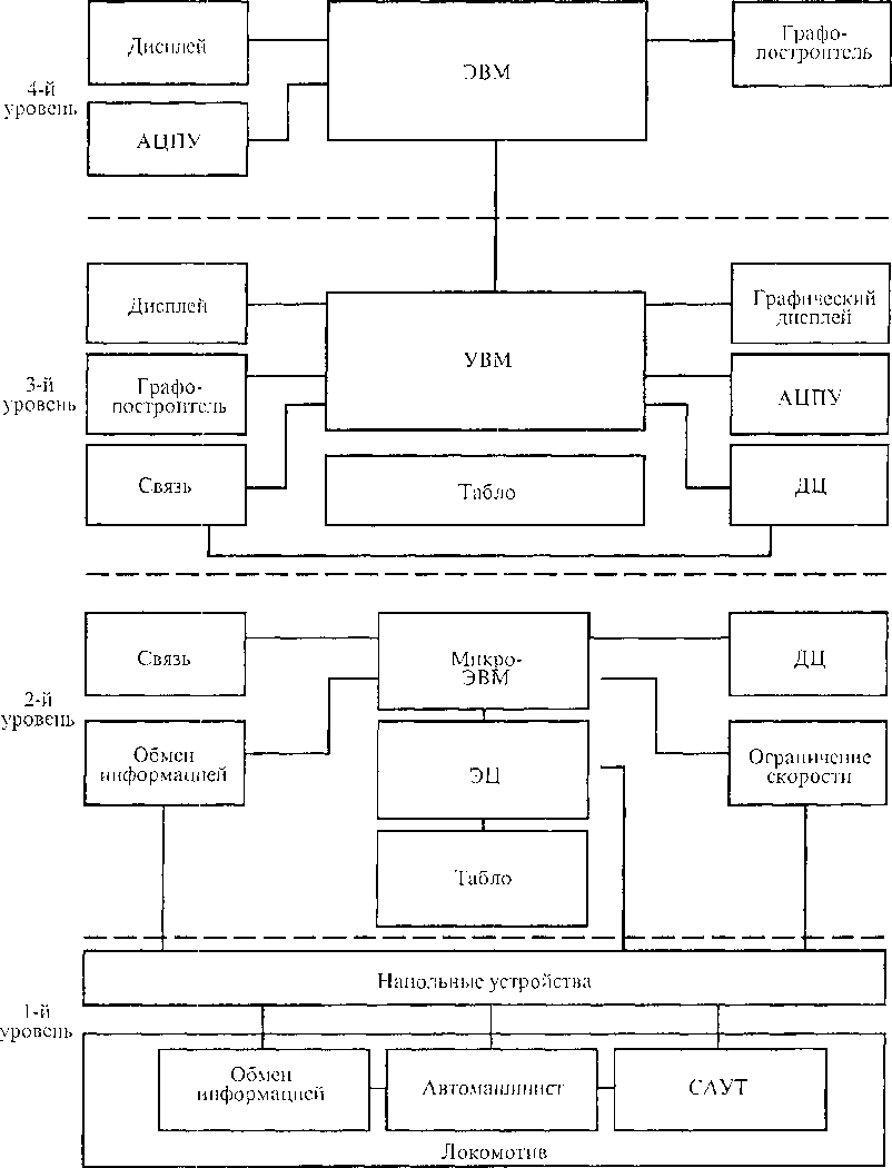 Для магистральных линий отечественных железных дорог со смешанным движением разработана и прошла испытание комплексная система автоматического управления движением поездов (КСАУДП), которая наиболее полно выполняет основные функции эксплуатационной деятельности железных дорог. Система имеет трехуровневую иерархическую структуру, на нижнем уровне которой осуществляется автоматический сбор информации о местонахождении всех поездов, локомотивов, групп вагонов, о положении стрелок и сигналов. Эта информация с помощью устройств второго (станционного) уровня передается в центр управления диспетчерским кругом (третий уровень). Из центра управления информация станционными устройствами передается на станции и локомотивы для реализации выработанных команд. Конечным этапом управления является исполнение команд аппаратурой, установленной на локомотиве. Станционные устройства имеют возможность контролировать заданное время хода по перегону, отображать номера поездов на экранах дисплеев, автоматически вести учет прибытия и отправления поездов и выполнение ряда других функций, определяющихся классом станций. На третьем уровне осуществляется отображение движения поездов на табло и экране дисплея в реальном масштабе времени с указанием их номеров, отклонений от графика, выдается в канал телеуправления командная информация на станции и локомотивы, ведется исполненный график движения поездов, прогнозируется и выдается диспетчеру информация справочного характера.