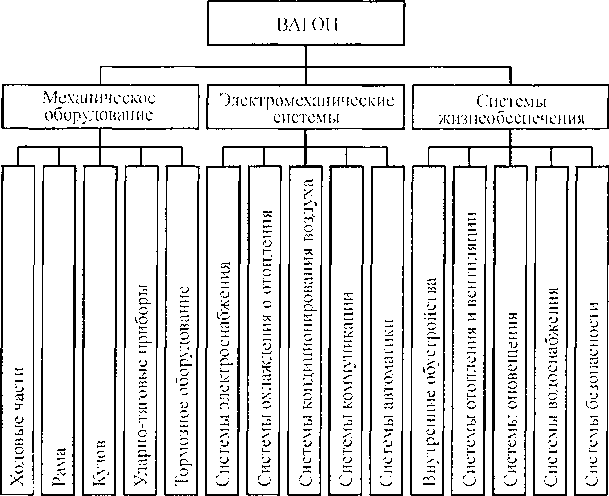 Надежная конструкция вагона учитывает его характерную' особенность — взаимодействие со всеми основными техническими средствами железных дорог и предприятиями народного хозяйства страны (вагоны подвергаются воздействию погрузочно-разгрузочных механизмов, маневровых и других операций). Второй особенностью вагона является сложность оборудования, включающего механические конструкции, электро технические, теплотехнические системы, а также системы автоматики, жизнеобеспечения и др. (рис. 13.1).