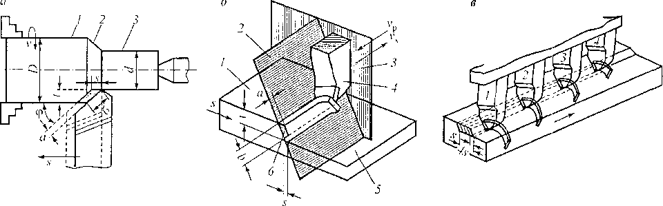 Рис. 13.4. Схемы технологических процессов обработки металлов резанием: а — при точении; / —обрабатываемая поверхность; 2 — поверхность резания; 3 — обработанная поверхность; D -- - диаметр обрабатываемой заготовки; d— диаметр детали после обработки; а и б — толщина и ширина срезаемого слоя; б — при строгании; 1 — обрабатываемая поверхность; 2 — плоскость резания; 3 — основная плоскость; 4 — опорная поверхность резца; 5 — обработанная поверхность; 6 — поверхность резания; а и б — толщина и ширина срезаемого слоя; в — при многорезцовом строгании; /, 2,3,4 — резцы; s — подача