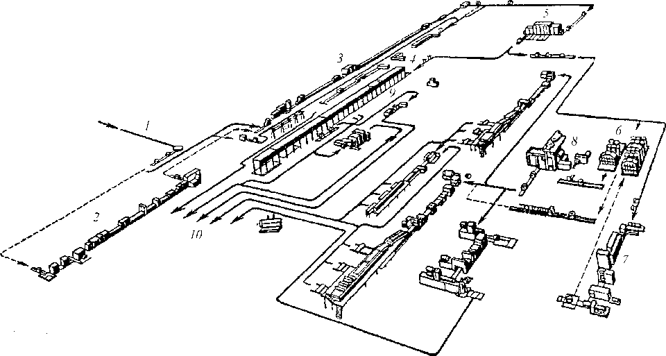 Рис. 13.6. Технологическая схема цеха холодной прокатки для производства листов: 1 — конвейер горячекатаных рулонов; 2 — агрегат нормализации; 3 — непрерывно-травильный агрегат; 4 — агрегат комбинированной резки; 5 — непрерывный стан холодной прокатки; 6 — термическое отделение; 7 — агрегат нанесения защитного покрытия, 8 — дрессировочный стан; 9 — непрерывно-цинковальный агрегат;