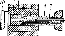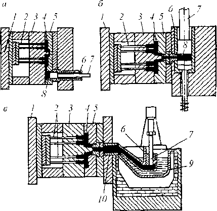 Рис. 13.13. Схемы литья под давлением на машинах с камерами прессования: а-- холодной горизонтальной; б — холодной вертикальной; в — горячей; 1 — плита крепления подвижной части формы; 2 — выталкиватели; 3 — подвижная матрица формы: 4 — полость формы (отливка); 5 — неподвижная матрица формы; 6 ■— камера прессования; 7 — прессующий поршень; 8— пресс-остаток; 9— тигель нагревательной передачи; 10- - обогреваемый мундштук