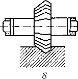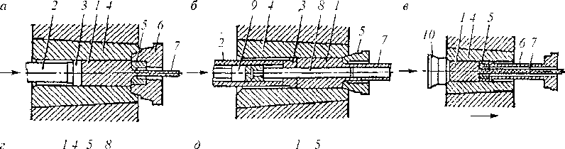 Рис. 13.7. Схемы прессования: а — профиля сплошного сечения с прямым истечением; б —- трубы с прямым истечением; в профиля сплошного сечения с обратным истечением; г — трубы с обратным истечением; д — трубы из полого профиля (прессование со сваркой); 1 — заготовка; 2 — пресс-штампель; 3 — пресс-шайба; 4 — контейнер; 5 — матрица; 6 — матрицедержатель; 7 — иресс-изделие; 8 —