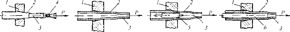 Рис. 13.8. Схемы волочения: а — проволоки; б-- трубы без оправки; в — трубы на короткой неподвижной оправке; а — трубы на длинной движущейся оправке; I — волока; 2 — заготовка; 3 — заостренный конец заготовки; 4— захват; 5 — короткая неподвижная оправка; 6 — длинная движущаяся оправка