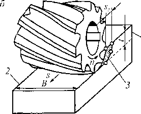 Рис. 13.9. Фрезерование: a — фрезы; 7 — цилиндрическая; 2 — торцевая; 3 и 4 — дисковые пазовые; 5 — прорезная; би 7— концевые; 8~ угловая; 9 и 10—фасонные; 11 — шпоночная; б—схема фрезерования цилиндрической фрезой; 1 —- обрабатываемая поверхность; 2 — обработанная поверхность; 3—поверхность резания; В- - ширина обрабатываемой поверхности; s—подача; t — глубина резания
