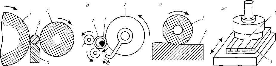 Рис. 13.11. Схемы работы шлифовальных станков: а — кругло-шлифовального; б — внутришлпфовалыюго; в — внутришлифовального планетарного; г — бесцентрово-шлифовального; д — бесцентрового внутришли- фовального; е—плоско шлифовального, шлифующего периферией круга; ж — шюскошлифовального, шлифующего торцом круга; 1 — шлифовальный круг; 2 - - хомутик; 3 — обрабатываемая деталь; 4 - - патрон;