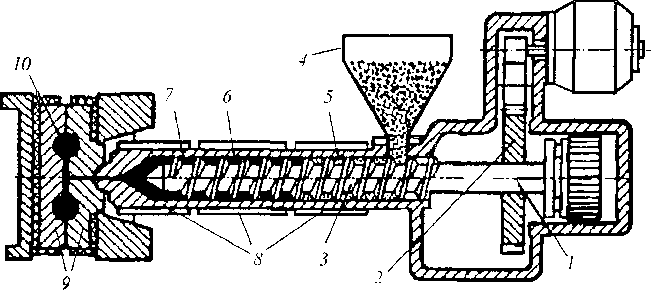 | Рис. 13.15. Схемы литья полимерных материалов и пластмасс: а — под давлением; 1 и 2 — приводы поступательного и вращательного движений червяка; 3 — червяк (при пластикации материала совершает вращательное и медленное поступательное движение вправо; при нагнетании материала в форму—быстрое поступательное движение влево); 4 — бункер; 5 — нагреваемый материал; 6 — расплавленный (пластицирован- ный) материал; 7 — обогреваемый цилиндр; 8 — обогреватели; 9 — литьевая форма; 10 — изделие; б — прессованием (трансферное прессование); 1 — плунжер; 2 — литьевой цилиндр; 3 — нагретый материал; 4— замкнутая форма; 5 — оформляющая полость формы; 6— изделие |