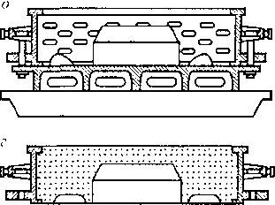 Технологический процесс литейного производства многообразен и подразделяется: по способу заполнения форм — на обычное литье, литье центробежное и под давлением; по способу изготовления литейных форм — на литье в разные формы (служащие для получения только одной отливки), литье в многократно используемые керамические или глиняно-песчаные формы, называемые полупостоянными (такие формы с ремонтом выдерживают до 150 заливок), и литье в многократно используемые, так называемые постоянно металлические формы, например кокили, которые выдерживают до нескольких тысяч заливок. При производстве заготовок литьем используют разовые песчаные, оболочковые самотвердеющие формы. Разовые формы изготовляют с помощью модельного комплекта и опоки (рис. 13.16).