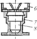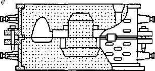 | Рис. 13.16. Основные элементы литейной оснастки при получении отливки в разовой форме: а и б— модельный комплект верхней и нижней полуформы с опокой; виг — верхняя и нижняя заформованные опоки; д — формовка стержневого ящика; е — литейная форма, подготовленная к заливке; 7 — направляющий штырь; 2 — подмодельная плита; 3 — стол формовочной машины; 4 — стержневой знак; 5 — модель; 6 — головка пескострелыюй машины; 7— стержневой ящик; 8 — стержень |