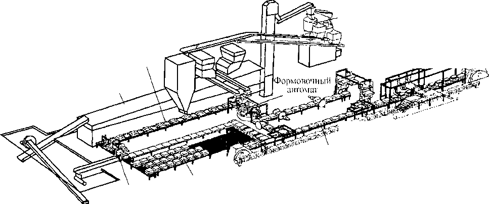 | Рис. 13.18. Автоматическая линия для изготовления форм, заливки их сплавом и выбивки готовых отливок |