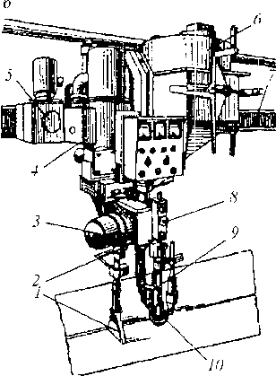 Рис. 13.20. Установки для дуговой сварки: а — автоматизированный пост; 1 — сварочный аппарат; 2 — свариваемое изделие; 3 -- шкаф с аппаратурой управления; 4 — источник тока; .5 — провода управления; 6 — токопровод; 7 — рельсовый путь; 8 — тележка с колонной; 9 — роликовый стенд; К) — площадка обслуживания; б -- автомат; 1 — флюсоотсос; 2 — сварочная головка; 3 — механизм подачи с редуктором; 4 — механизм подъема; 5 — ходовой механизм; 6 - - флюсоаппарат; 7 — рельсовый путь; 8 — i юдающий