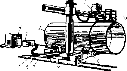 Большинство процессов сборки и сварки котла железнодорожных цистерн выполняется с помощью сварочных автоматов и полуавтоматов. Уложенные на плиту стенда (рис. 13.30) заранее подготовленные листы цилиндрической части котла свариваются автоматическими аппаратами, смонтированными на устройствах портального типа.