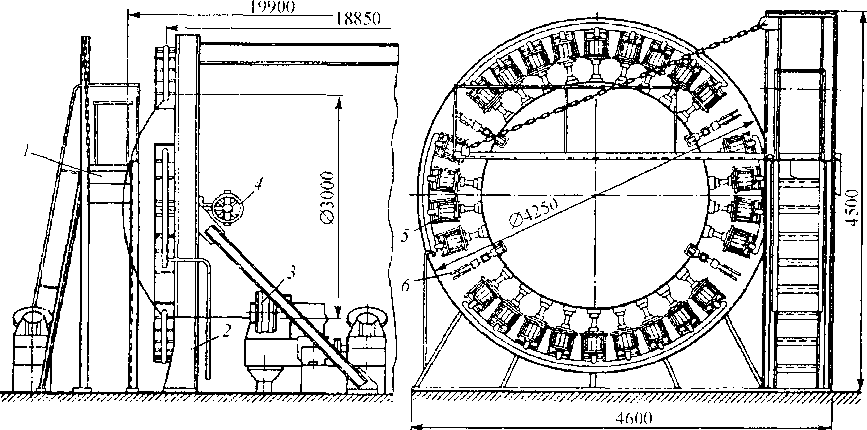 Рис. 13.21. Стенд для приварки днищ к обечайке котла цистерны: 1 — площадка сварщика; 2 — рама стенда; 3 — роликовая опора; 4— маховик стяжки; 5 — - пневматический зажим; 6— откидная стяжка