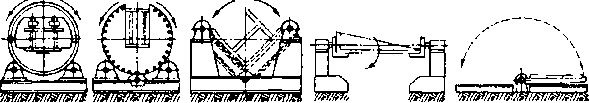 Вспомогательное оборудование сварочных установок комплектуют из элементов, предназначенных для расположения изделия в наиболее удобном для сварки положении, для поворота его во время работы и обслуживания зоны сварки, а также для крепления и перемещения сварочных аппаратов. С целью установки изделий в удобное для работы положение применяют кантователи (рис. 13.22), поворот свариваемого изделия вокруг оси осуществляют вращателями с вертикальной, наклонной или горизонтальной осями вращения. При сварке цилиндрических изделий применяют роликовые стен- а ^ _ б в г д