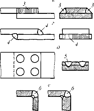 Рис. 13.23. Виды сварных соединений и типы швов при дуговой сварке: а — стыковое; б — тавровое; «, г, д — нахлесточ- ные; е — угловое; / — стыковой шов; 2 — угловой шов таврового соединения; 3 — фланговый угловой шов нахлесточ- ного соединения; 4 — лобовой угловой шов нахлесточного соединения; 5 — электрозаклепочный шов нахлесточного соединения; 6 - - шов углового соединения