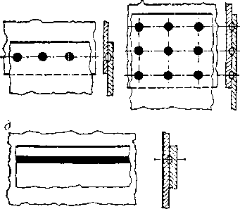 | Рис. 13.24. Виды сварных соединений и типы швов при контактной сварке; а — стыковое при сварке сопротивлением; б—стыковое при сварке плавлением; в—нахлесточное, выполненное однорядным точечным швом; е— нахлестанное, выполненное многорядным точечным швом; д— нахлесточ- ное, выполненное однорядным роликовым швом |