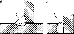 | Рис. 13.25. Виды сварных соединений и типы швов при электрошлаковой сварке: а — стыковое; б — тавровое; в — угловое; / —стыковой шов; 2— угловой шов; 3 — шов углового соединения |