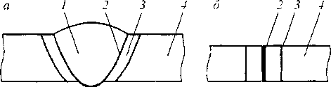 Рис. 13.26. Сварное соединение: / — сварной шов; 2— зона сплавления (а) или соединения при сварке давлением (б)\ 3 — зона термического влияния; 4 — прилегающий основной материал