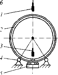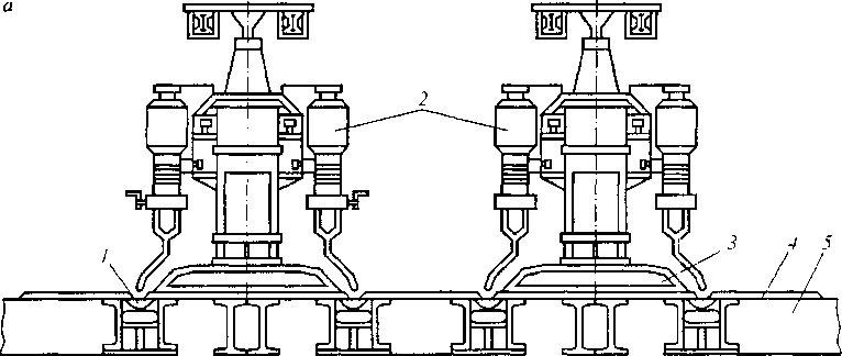 Рис. 13.30. Сборка цилиндрической части котла цистерны: а — стенд для авгома шческой сварки; / — флюсовая подушка; 2 - сварочные автоматы; 3 - прижимная траверса; 4 - свариваемые листы; 5 — основание стенда; 6-- стенд для наложения продольных швов; I - - автоматическая головка, смонтированная на портальном устройстве; 2 — обечайка котла; 3 - сварочный трактор; 4 —- стенд; J — балка с магнитным прижимом и флюсовой подушкой; в -стенддля наложения кольцевых швов; / -сварочный трактор; 2 — флюсовая подушка; 3— непрерывная лента; г — сварочный трактор; / — ходовая часть; 2 - катушка; 3 — электродная проволока; 4 — пульт управления; 5 — головка