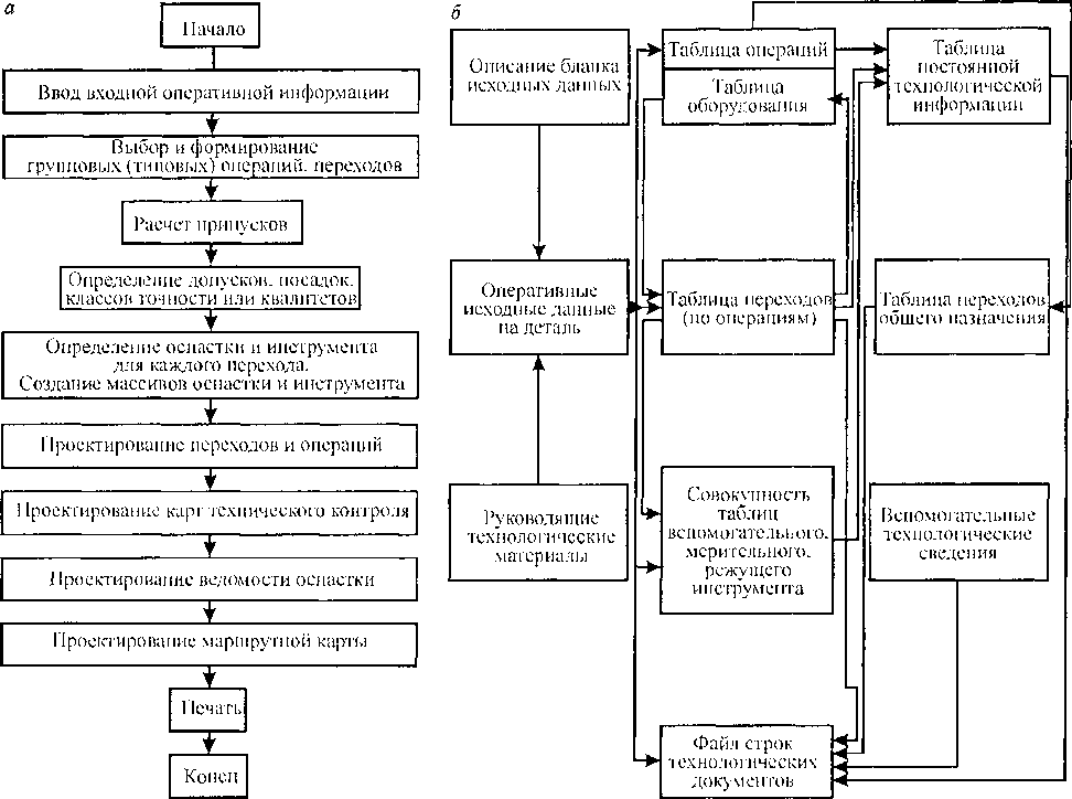 Макросхема алгоритма САПР технологических процессов приведена на рис. 13.31, л. Осуществляется ввод оперативной информации, из которой выбираются и формируются групповые (типовые) операции, переходы по их кодам в исходных данных и типовым маршрутам из нормативно-справочной информации. Припуски рассчитываются по нормалям предприятия. Поиск оснастки и инструмента, включенных технологом в исходные данные, осуществляется по универсальным блок-схемам и таблицам. При разработке алгоритмов и программ, а также в процессе эксплуатации автоматизированной системы проектирования технологических процессов механической обработки необходимо иметь данные, указанные на рис. 13.31, б.