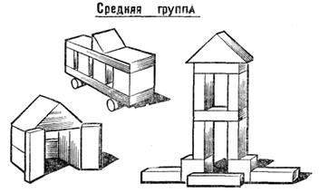 Если в предшествующих группах ребенок в основном подражал действиям воспитателя, воспроизводил постройки по его образцу, лишь добавляя некоторые детали, то в средней группе он уже может назвать тему постройки, которую собирается сделать, способен выполнять задуманное до конца. Но темы часто меняются под влиянием внешних обстоятельств и порой могут быть реализованы лишь с помощью воспитателя.