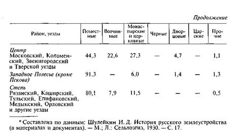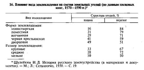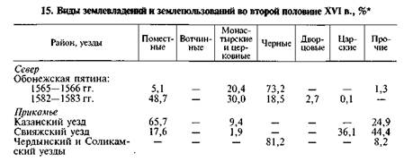 Соотношение различных видов землевладений и землепользовании в Московском царстве во второй половине XVI в. показано в табл. 15. Из нее видно, что наличие тех или иных форм землевладения и землепользования сильно зависело от природных, исторических и территориальных условий. Однако в большинстве освоенных и густонаселенных земледельческих районов ко второй половине XVI в. стало явно преобладать поместное землевладение, ставшее опорой царской власти и основой сложившегося к тому времени земельного строя.