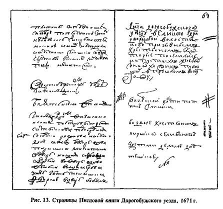 Записи осуществлялись в писцовых книгах. С технической точки зрения производилось только описание земель без изображения на бумаге землевладений и землепользовании в виде чертежей или планов. Это объяснялось тем, что в то время в России практически не было лиц, знакомых с правильными геометрическими приемами и сложными землемерными инструментами (рис. 13).