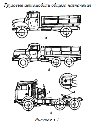 К автомобилям общего назначения(рисунок 5.1) относятся автомобили с открытой платформой и откидными бортами для перевозки любых видов грузов (см. рисунок 5.1,а) в том числе автомобили повышенной проходимости (см. рисунок 5.1,б) со всеми ведущими колесами, а также оборудованные сцепным седельным устройством 1 (см. рисунок 5.1,в) для буксировки прицепов и полуприцепов. Вместе с прицепом или полуприцепом автомобиль образует автопоезд.