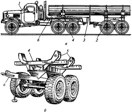 Трубо- и плетевозы (рисунок 5.4) предназначены для перевозки труб длиной до 12 м и плетей (секций, сваренных из труб) длиной до 36 м по дорогам с твердым покрытием, грунтовым дорогам, а также вне дорог вдоль трассы строительства трубопроводов. Трубо- или плетевоз состоит из тягача 1 (см. рисунок 5.4,а) и прицепа-роспуска 2. Тягач и прицеп оборудуют кониками 4 для укладки труб (плетей), на которых имеются переставные стойки-упоры 5 с устройствами для увязки труб. Трубы (плети) при транспортировании выполняют функцию жесткой связи между тягачом и прицепом-роспуском. Последний оснащен сцепным устройством 6 для соединения его с тягачом при движении без груза, а также страховочным канатом 3. Грузоподъемность автопоезда составляет 9…36 т.