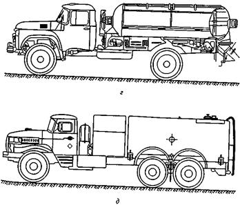 а – цементовоз; б – бетоновоз; в – автобетоносмеситель; г – авторастворовоз; д — автотопливозаправщик