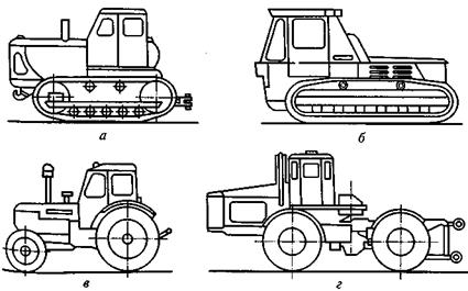 гусеничные с передним (а) и задним (б) расположением двигателя; пневмоколесные с передними управляемыми колесами (в) и шарнирно-сочлененной рамой (г)