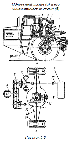 Одноосный тягачсостоит из шасси, на котором установлен двигатель 6 (рисунок 5.8.), силовая передача, два ведущих колеса, кабина и опорно-сцепное устройство, состоящее из стойки 2, которая может качаться относительно продольной горизонтальной оси, закрепленной на раме тягача, что позволяет полуприцепу перекашиваться относительно тягача в вертикальной плоскости, и вертикального шкворня 3 для соединения тягача с полуприцепом. Поворот тягача относительно полуприцепа на 90° в каждую сторону обеспечивается двумя гидроцилиндрами 4. Гидромеханическая силовая передача состоит из раздаточной коробки 7, гидротрансформатора 8, коробки перемены передач 9, карданных валов 10 и 12, моста с главной передачей и дифференциалом 11, полуосей 13 и планетарных редукторов 14, встроенных в ступицы колес. От раздаточной коробки через вал 12 приводятся один или несколько насосов 5 для обеспечения работы исполнительных органов прицепного орудия. Управляют тягачом и рабочим оборудованием с помощью блока 1.