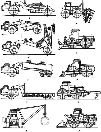 а – скрепер; б – землевоз; в – кран; г – цистерна для цемента и жидкостей; д – тяжеловоз; е – кран-трубоукладчик; ж – траншейный экскаватор; з – корчеватель; и – бульдозер; к – рыхлитель; л – погрузчик