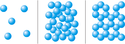Спеціальними дослідженнями встановлено, що молекули речовини не змінюються при зміні його агрегатного стану. Наприклад, на рисунку 2.10 показано розташування молекул однієї і тієї ж речовини - води в трьох агрегатних станах. Пар (рис 2.10а), вода (рис 2.10б) і лід (рис 2.10в). Молекули пари, води і льоду не відрізняються одна від одної. Отже, ці три стани речовини розрізняються не молекулами, а тим, як молекули розташовані і як рухаються.