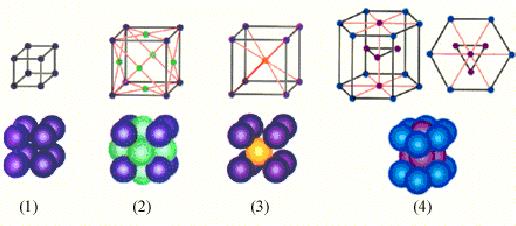 Прості кристалічні грати: 1 - прості кубічні грати; 2 - гранецентровані кубічні грати; 3 - об’ємноцентровані кубічні грати; 4 - гексагональні грати.