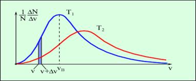 На рисунку 2.31. показано дві криві розподілу швидкостей при різних температурах. Червона, більш полога крива, показує розподіл швидкостей за законом Максвелла при вищій температурі, ніж температура, до якої відноситься перша (синя) крива. Зіставлення цих двох кривих наочно виявляє властивості рівняння Максвелла. Видно, що при підвищенні температури росте найбільш ймовірна швидкість (максимум кривий розподіли зрушується направо); це відповідає тій обставині, що при підвищенні температури швидкості молекул зростають. Крива Максвелла при підвищенні температурі стає біль пологою: це означає, що при підвищенні температури розподіл молекул за швидкостями стає більш рівномірним.