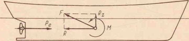 плоскости, то действие гидродинамических сил реакции воды может быть сведено к одной равнодействующей силе F, лежащей в диаметральной плоскости и моменту М, действующему в той же плоскости (рис. 2.5). Горизонтальная составляющая R силы F является силой сопротивления воды; она уравновешивается полезной тягой движителя.