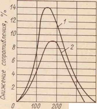 | Рис. 2.11. Влияние гндрофоль- ного покрытия «Гидрон» на снижение сопротивления 1 — гидрофольное покрытие: 2 — обычное винильное покрытие |