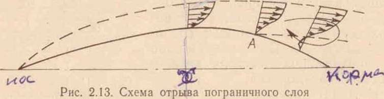 Если бы жидкость была идеальной, то запаса кинетической энергии частиц хватило бы для преодоления противодавления на пути от миделя в корму и каждая частица достигла бы ахтер- штевня. В реальной же вязкой жидкости при движении частиц внутри пограничного слоя затрачивается дополнительная энергия на преодоление касательных сил вязкостного трения. У частиц, движущихся внутри пограничного слоя вблизи поверхности судна, скорости малы и соответственно мал и запас кинетической энергии. Этот запас энергии может оказаться недостаточным для преодоления положительного градиента давления при движении частиц от миделя в корму, и в результате некоторые частицы под действием возрастающего давления могут начать двигаться в обратном направлении, т. е. против набегающего потока. Такой обратный поток оттесняет пограничный слой от поверхности тела (рис. 2.13). Точка А, в которой начинается это оттеснение, называется точкой отрыва пограничного слоя. Отрыв пограничного слоя с образованием вихрей искажает картину обтекания судна в его кормовой части по сравнению с той, которая наблюдалась бы при обтекании идеальной (невязкой) жидкостью. Давление в кормовой части судна уменьшается, и, следовательно, появляется результирующая нормального давления, направленная в сторону, противоположную движению судна. Эта результирующая и является сопротивлением формы судна. Поскольку величина сопротивления формы зависит от интенсивности вихреобразования, то его часто называют вихревым сопротивлением.